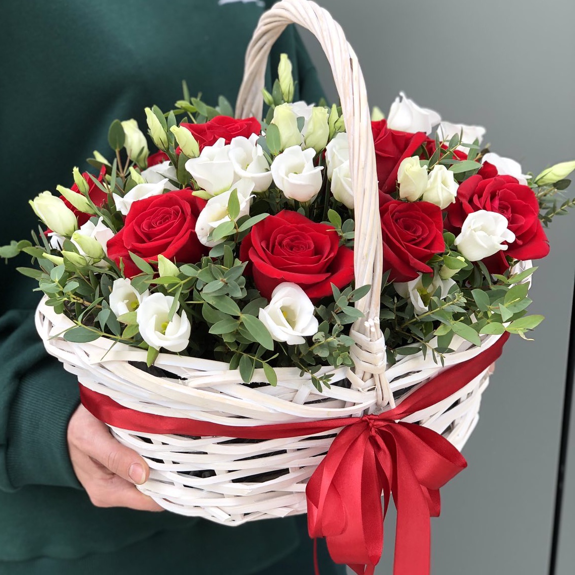 Композиция из алых роз и белой эустомы оформленная в плетеную корзину это сюрприз, способный выразить адресату все Ваши чувства, которые таяться у Вас в сердце! Этот букет, главной особенностью которого является цветовой контраст, станет необычайным подарком по поводу и без!